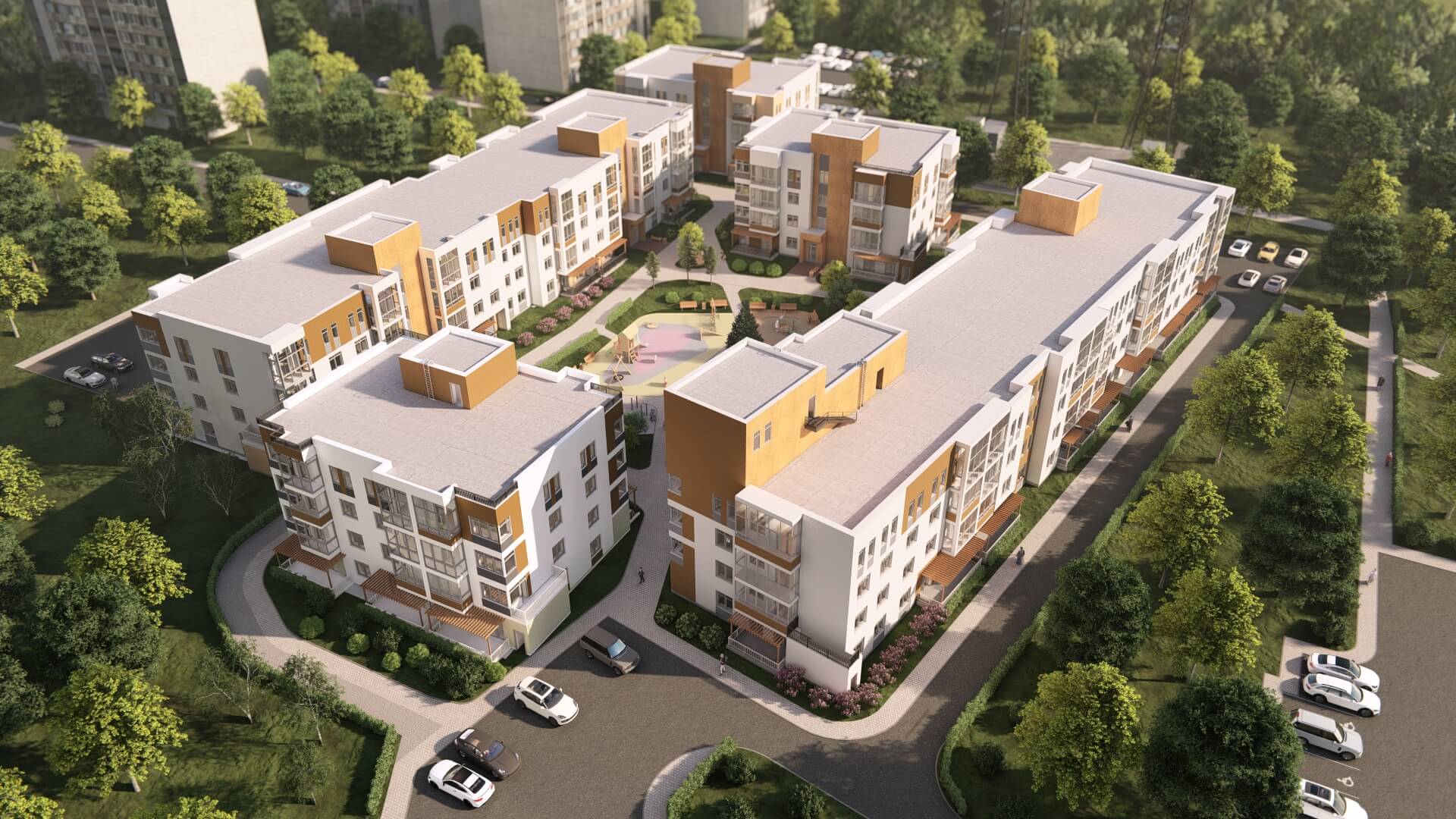 Дворовые пространства кварталов развивают идею отдыха на свежем воздухе и предназначены для всех жителей. Зоны спокойного отдыха отдалены от спортивных площадок и комплексов для игр маленьких детей. Территория активного времяпровождения отделена от прогулочной аллеи.
