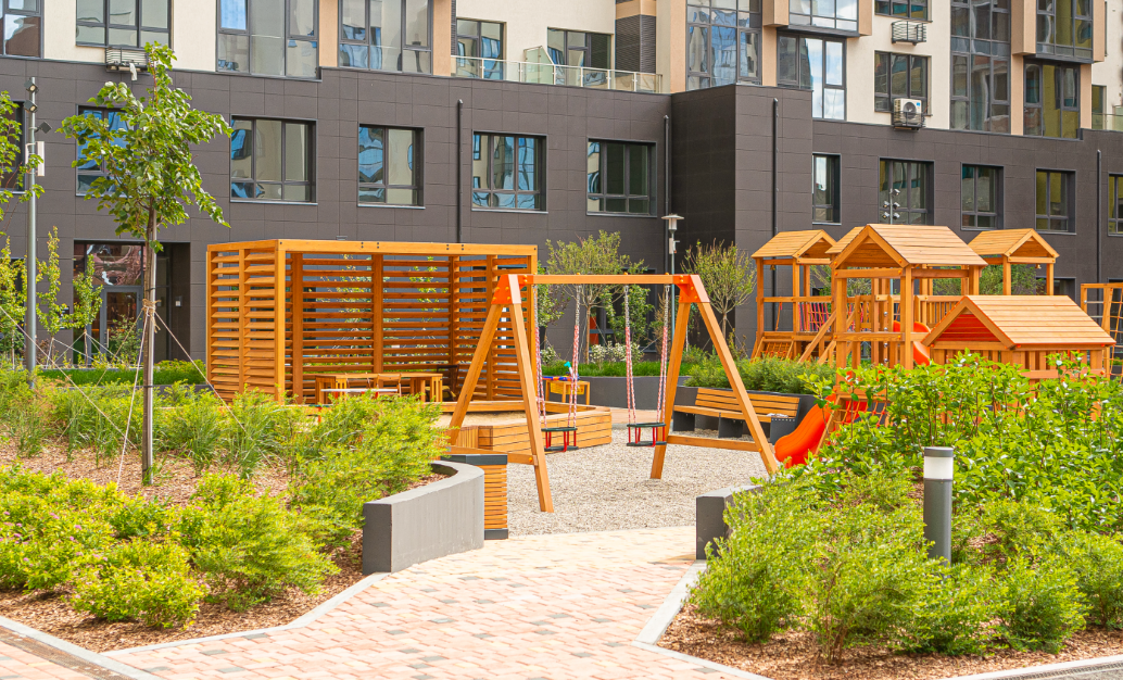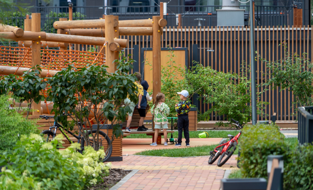 Обустроенные детские площадки из натуральной лиственницы, спортивные корты для летних игр и workout-зоны станут местом притяжения для маленьких резидентов и любителей занятий спортом на свежем воздухе в любое время года.